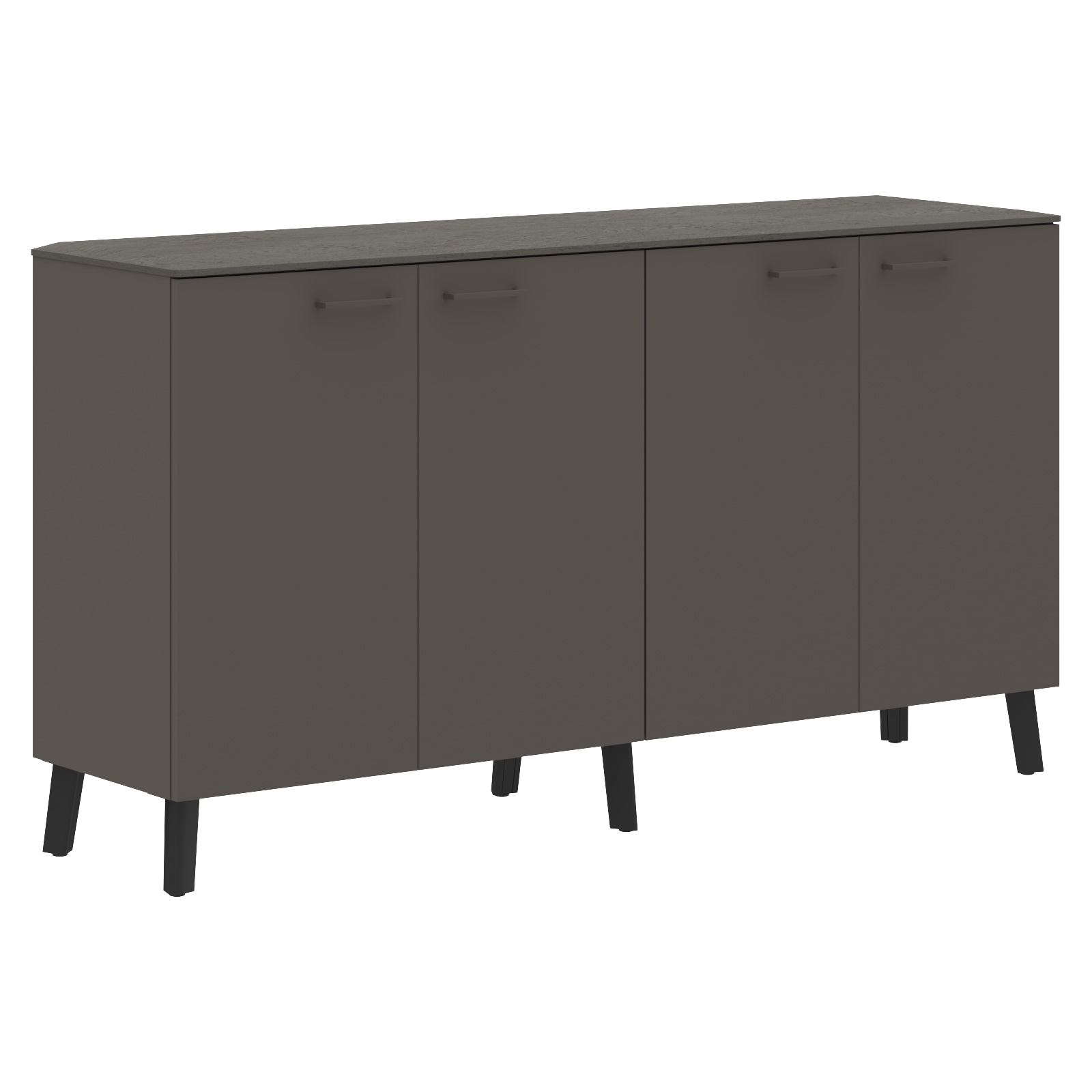 Корпус греденции выполнен из ЛДСП толщиной 18 мм, цвет – антрацит. Двери – из ЛДСП 18 мм с кромкой ПВХ 2 мм по периметру, цвет – орех мокко. Задняя стенка – из ХДФ 3,2 мм. Ручка-скоба, цвет – черный. Комплектуется опорами с регулировкой под неровности пола.