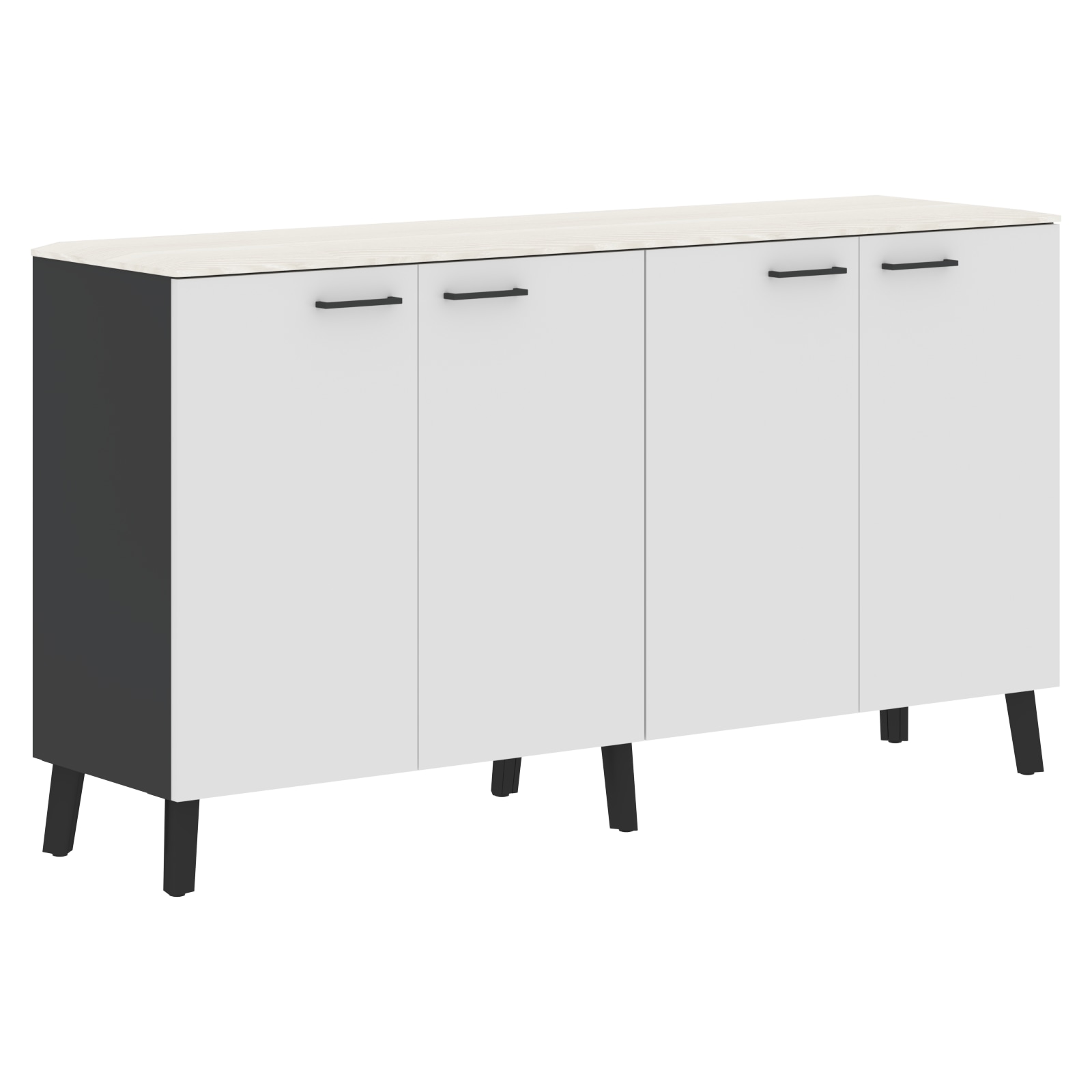 Корпус греденции выполнен из ЛДСП толщиной 18 мм, цвет – антрацит. Двери – из ЛДСП 18 мм с кромкой ПВХ 2 мм по периметру, цвет – ясень белый. Задняя стенка – из ХДФ 3,2 мм. Ручка-скоба, цвет – черный. Комплектуется опорами с регулировкой под неровности пола.