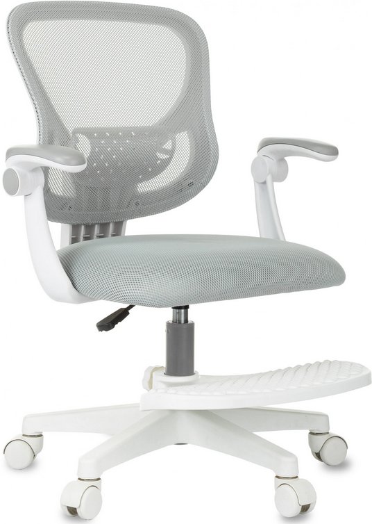 Белый пластик, обычный черный газлифт, регулирующаяся по высоте подставка для ног, поднимающиеся локти (белые с серой пластиковой накладкой)