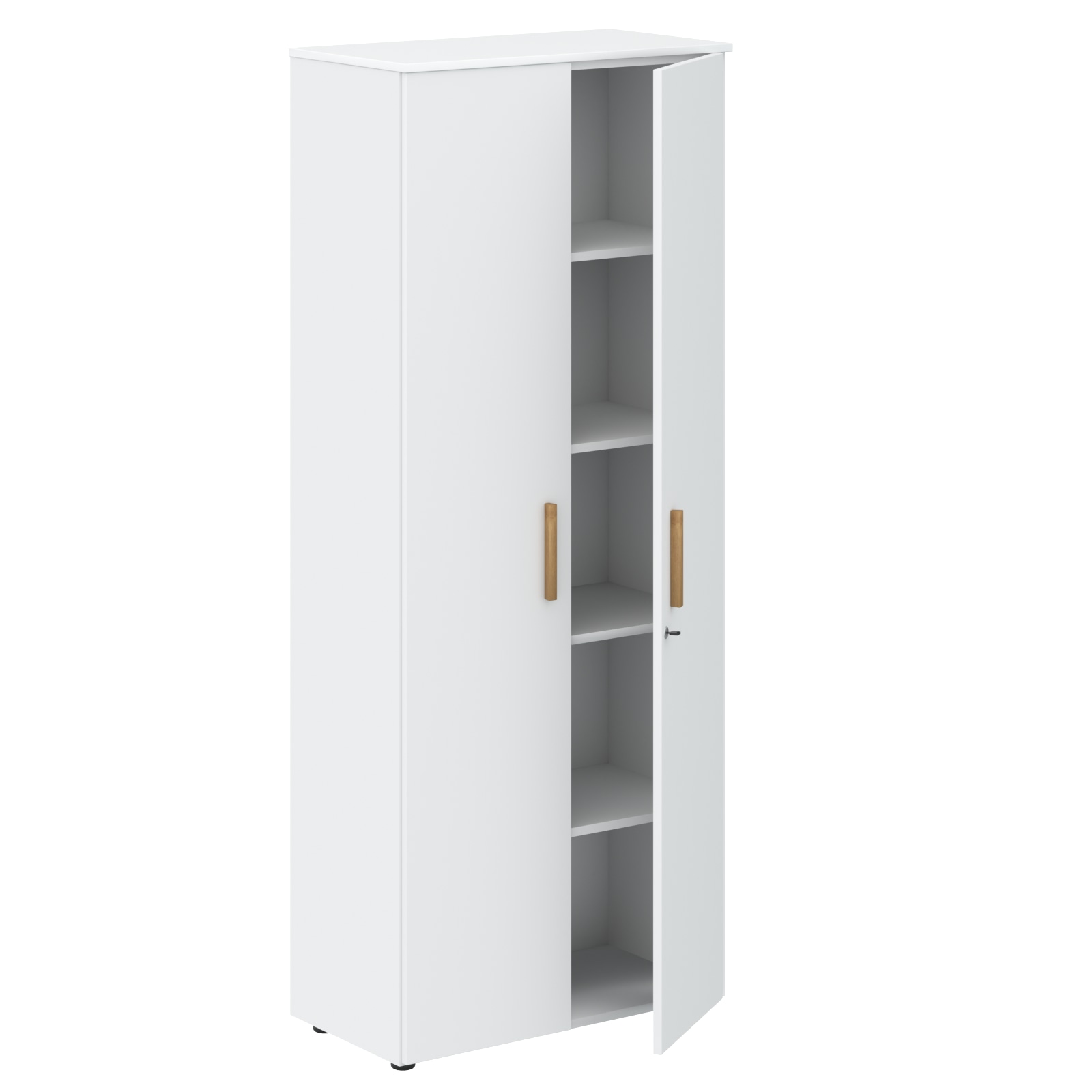 Шкаф и двери выполнены из ЛДСП (толщиной 18 мм.) в цвете белый премиум. Есть замок. Ножки шкафа регулируются.
