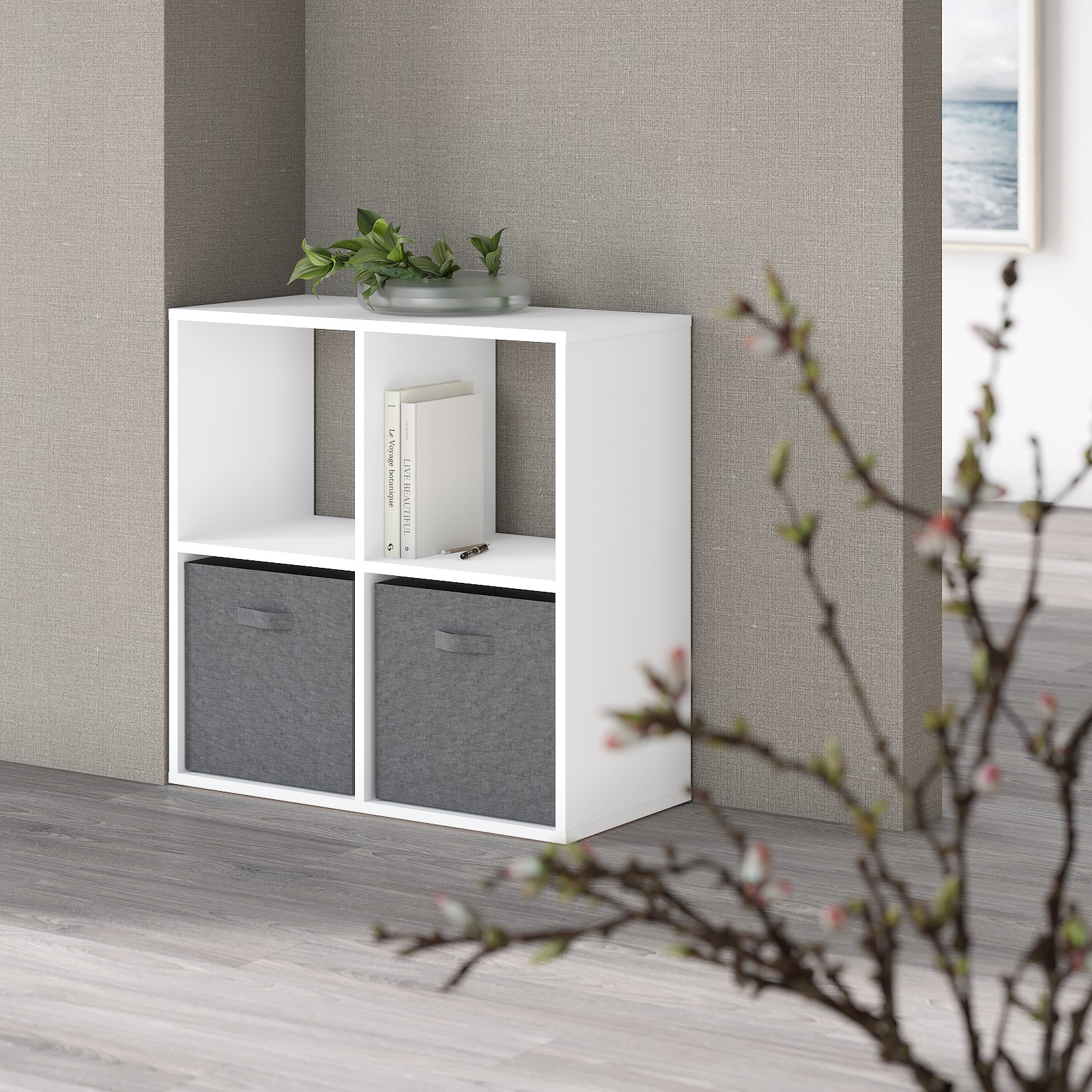 Стеллаж имеет 4 ячейки размером 32,6 см, что позволяет легко ставить в них типовые декоративные коробки. Это делает его удобным для хранения различных предметов, начиная от книг и заканчивая декоративными коробками.