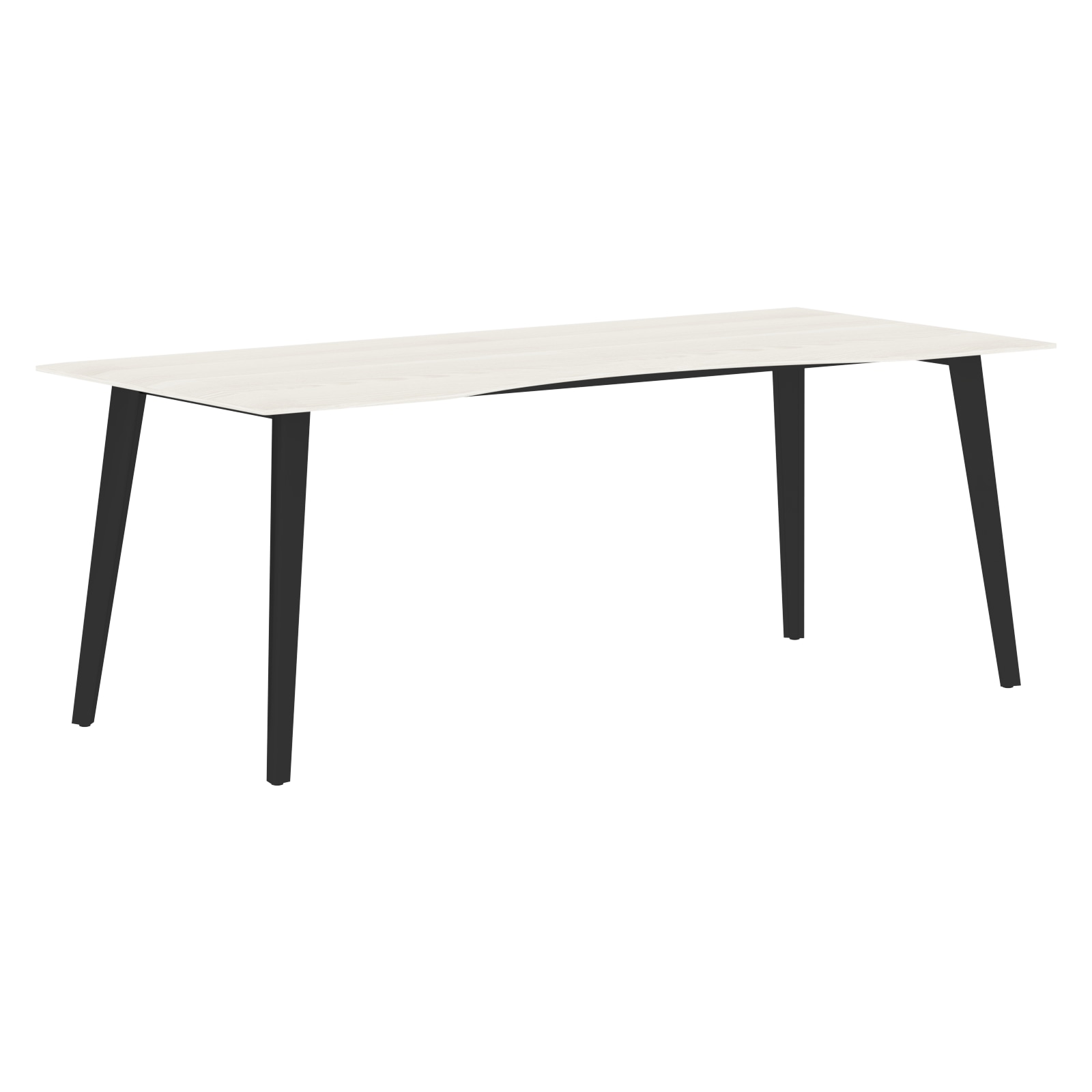 Столешница эргономичная, выполнена из одностороннего МДФ толщиной 19 мм в пленке ПВХ с фрезеровкой по периметру, цвет – ясень белый/антрацит, размеры – 2000х900 мм. Офисный стол комплектуется металлическими опорами треугольно-конической формы и траверсами рамочного соединения, цвет опор – антрацит.