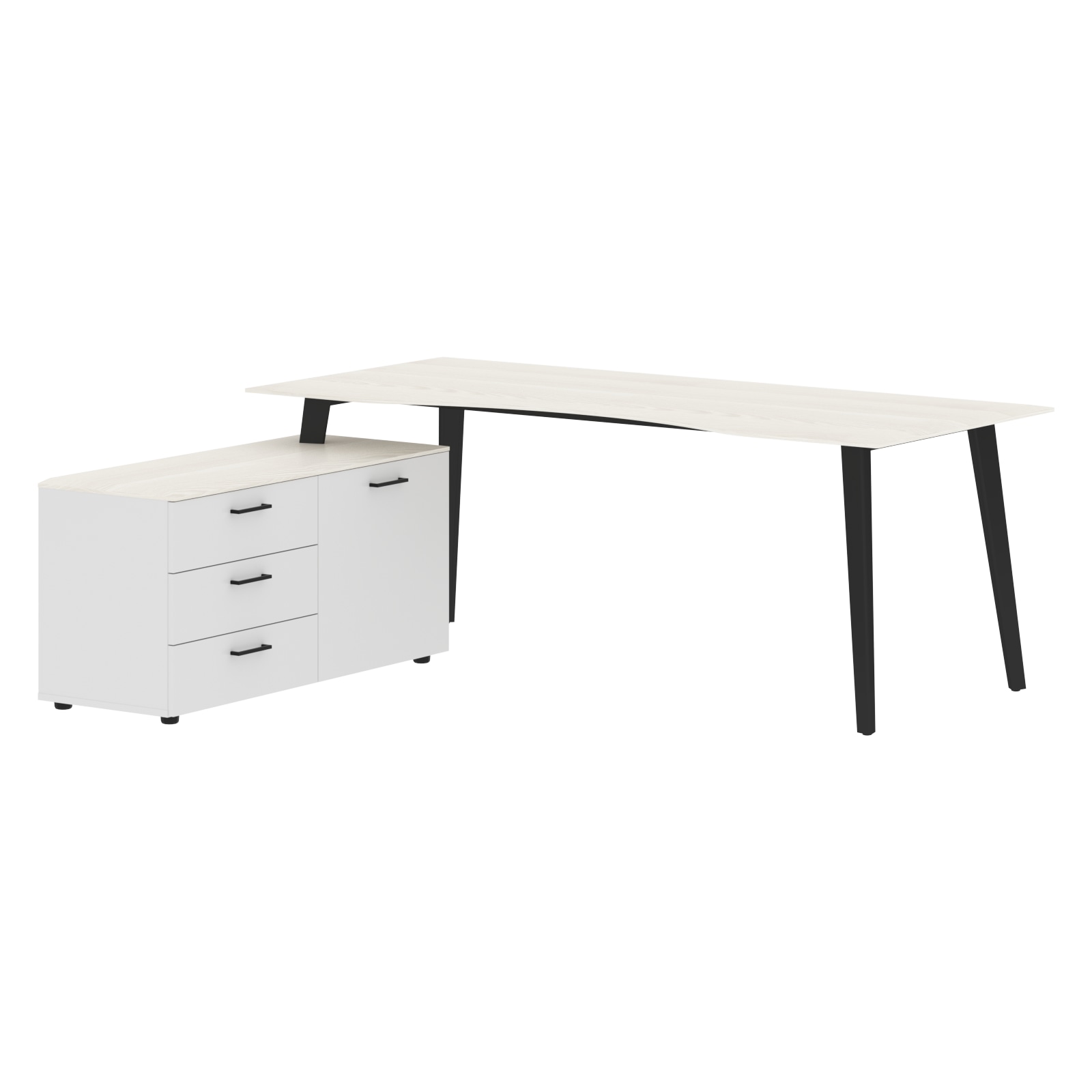 Столешница эргономичная, выполнена из одностороннего МДФ толщиной 19 мм в пленке ПВХ с фрезеровкой по периметру, цвет – ясень белый, размеры – 2000х1800 мм. Офисный стол комплектуется приставной тумбой с левой стороны и металлическими опорами треугольно-конической формы с траверсами рамочного соединения, цвет опор – антрацит. Тумба выполнена из ЛДСП в цвете ясень белый, имеет две секции: секция с двумя полками и глухой дверью и секция с 3-мя ящиками-фолдингами.