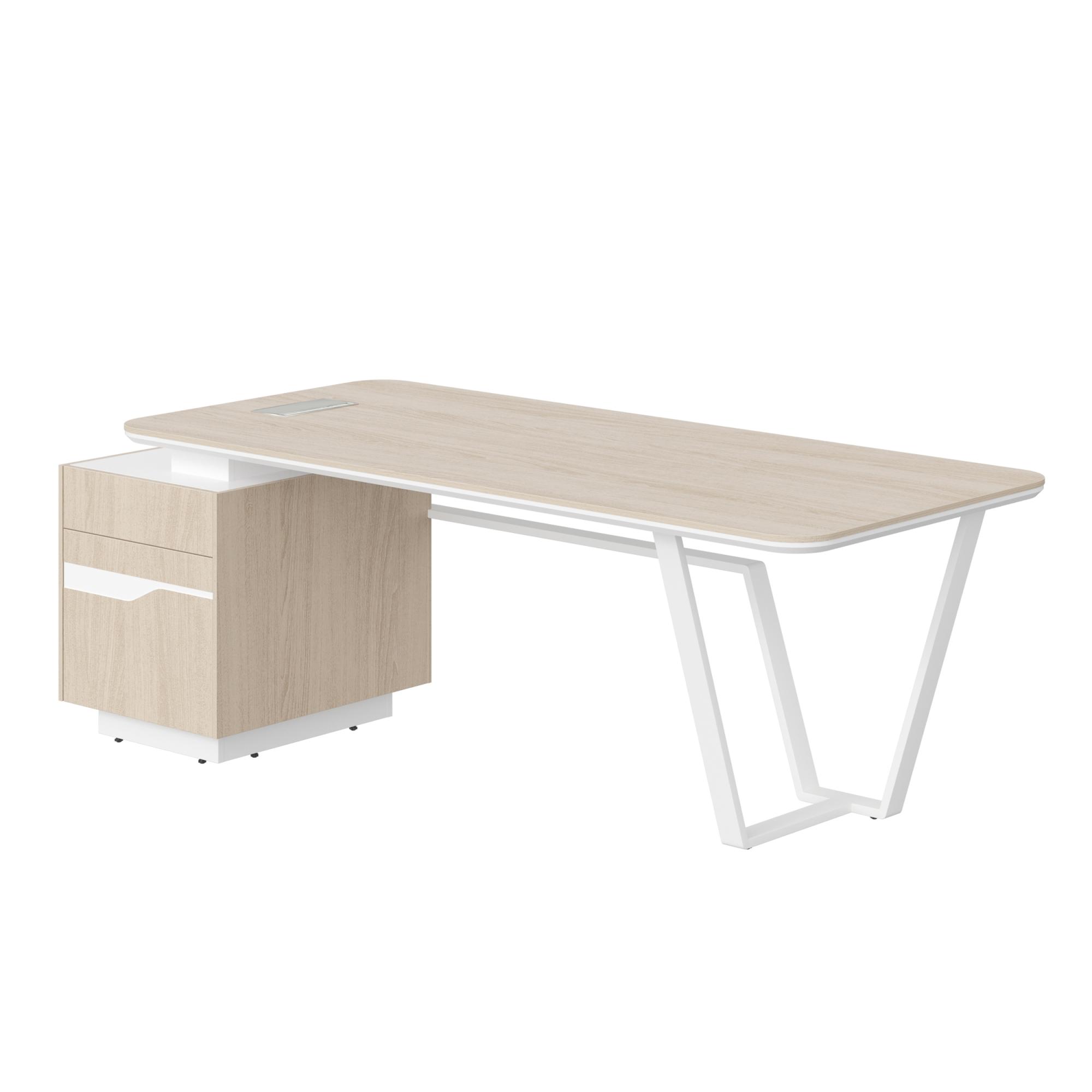 мм. Верхняя часть из МДФ т.12мм, покрытие - шпон. Нижняя часть из окрашенного МДФ т.25мм, имеет фрезерованный скос по внешнему краю. Каркас тумбы из ЛДСП т.18мм, кромка ABS т.0.8мм. Декоративные боковые стенки и задняя стенка тумбы - из МДФ т.12мм, покрытие - шпон. Фасады тумб - фрезерованное МДФ т.19мм, покрытие - шпон, декоративные вставки - покрытие цветной эмалью. Ящики из ЛДСП, скрытые шариковые направляющие полного выдвижения с системой открывания "push to open". Опоры из металла 20х60 мм, толщина металла 1,5 мм, покрытие порошковой краской. Столешницы оснащены встраиваемым блоком розеток, корпус блока - алюминий, дополнен крышкой и защитными щеточками. Внутри блока - сетевые розетки, USB и сетевые порты.